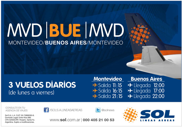 A raíz de la desaparición de la aerolínea Pluna, SOL Líneas Aéreas anuncia que a partir del próximo lunes incorporará tres vuelos diarios de Montevideo a Aeroparque (Buenos Aires).