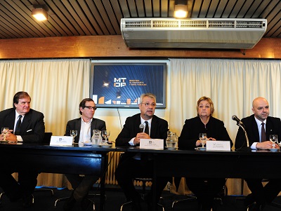 Gerente General de Copa Airlines Uruguay, Hugo Perelli; Jefe de Gabinete del Ministerio de Transporte y Obras Públicas, Andrés Copelmayer; Ministro de Transporte y Obras Públicas, Enrique Pintado; Ministra de Turismo Liliam Kechichian, y Subsecretario de Turismo, Antonio Carámbula.