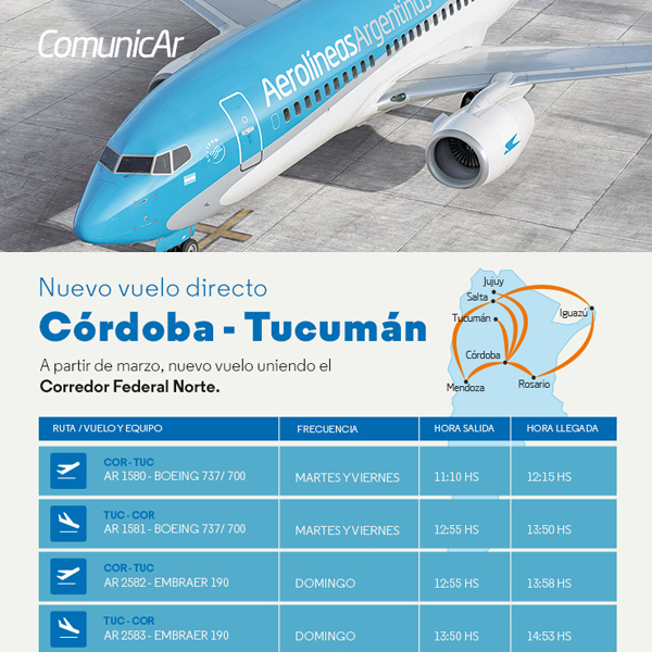 El vuelo AR1820, operará los días lunes, miércoles, viernes y domingo; y tendrá una escala de una hora en Buenos Aires. De esta manera, partirá desde Puerto Iguazú a las 8.05 de la mañana y arribará a Aeroparque a las 10. Luego despegará desde Buenos Aires a las 11, arribando a El Calafate pasadas las 14.