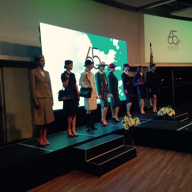 Una gran escultura de valijas coronaba el ingreso al salón y era el comienzo de un viaje que llevaría por los 65 años de LAN, para luego vivenciar un desfile donde modelos mostraron diferentes uniformes de azafatas a lo largo de los años.