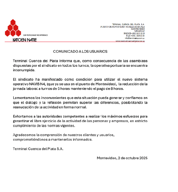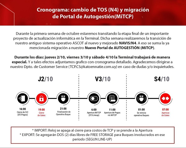 Terminal Cuenta del Plata (TCP) concluye en los primeros días de este mes un estratégico programa de modernización informática en las instalaciones portuarias. En dicho lapso realizará la transición del antiguo sistema operativo ASCOT al nuevo y actualizado NAVIS/N4. Además ,se está llevando a cabo la migración al Nuevo Portal de AUTOGESTIÓN (MITCP) . Por ello,la Terminal está trabajando de forma especial entre los días jueves 2 de octubre, viernes 3 y sábado 4 . En caso de dudas y/0 inquietudes se solicita dirigirse al Departamento de Customer Service (TCP.CS@katoennacie.com.uy).